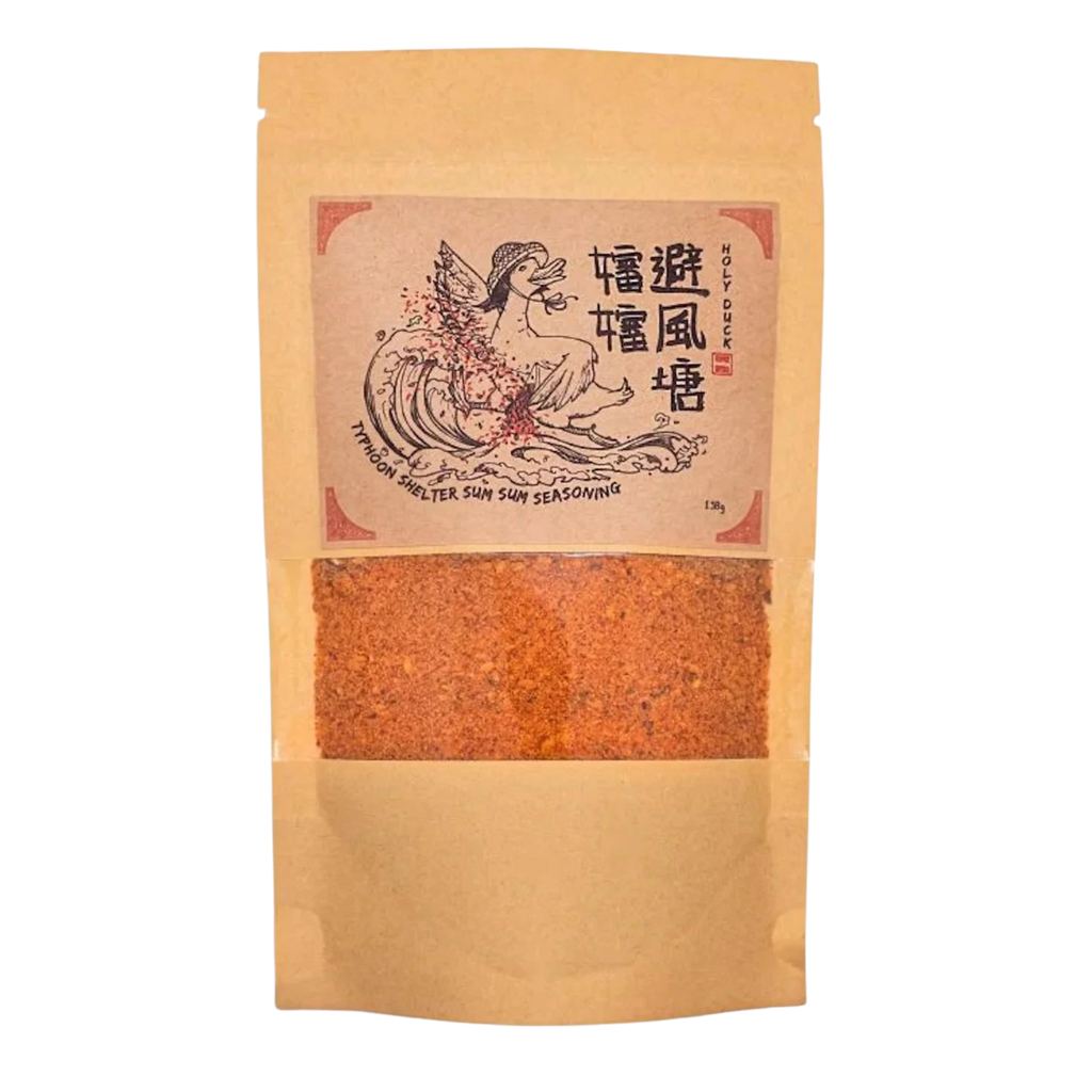 Drawing inspiration from the traditional flavours of old Hong Kong and its roots as a fishing village, Holy Duck Chili Typhoon Shelter Sum Sum seasoning is our gastronomical representation of this special dish. The words 嬸嬸 [sum2 sum2], which is a homophone in Cantonese meaning “sprinkle sprinkle” or “auntie”, pays homage to the tough and mighty old ladies that work tirelessly at sea. A meticulous blend of over 20 natural ingredients is infused with duck fat over a fry wok to allow the flavours and aromas to fully mature and permeate into perfectly golden garlic and shallot crisps.